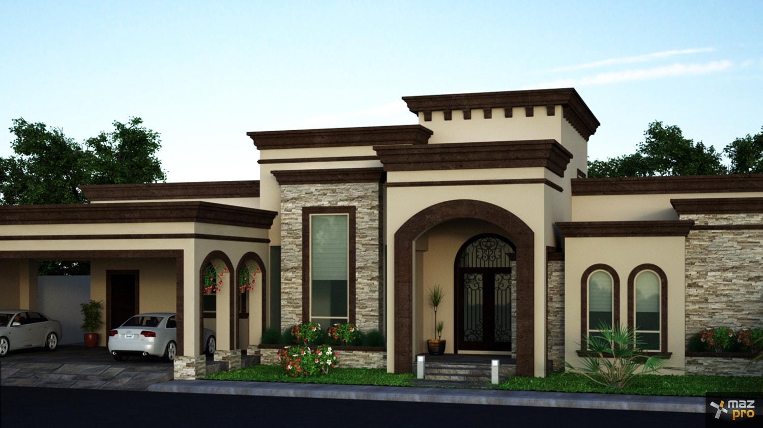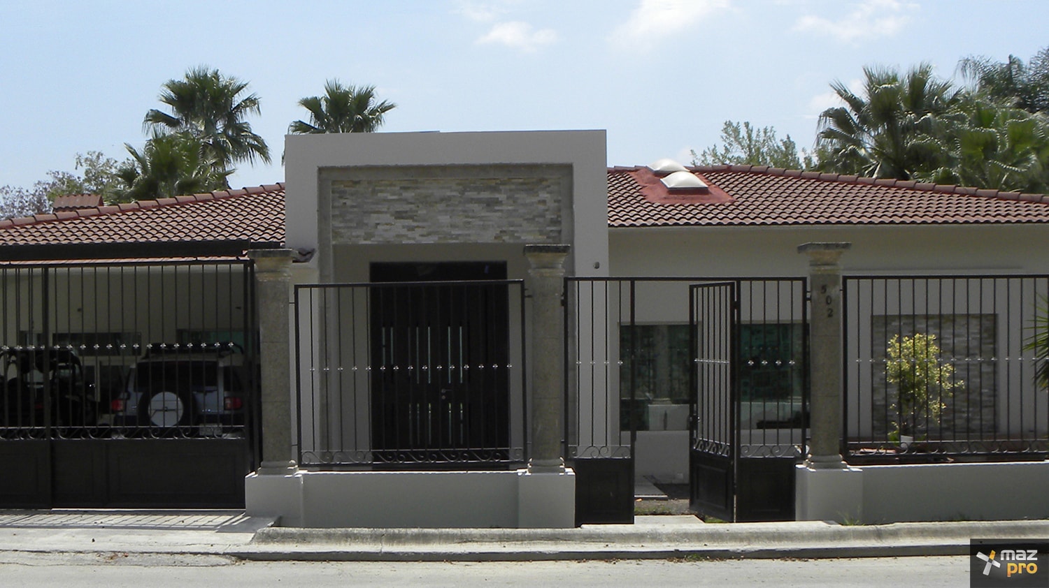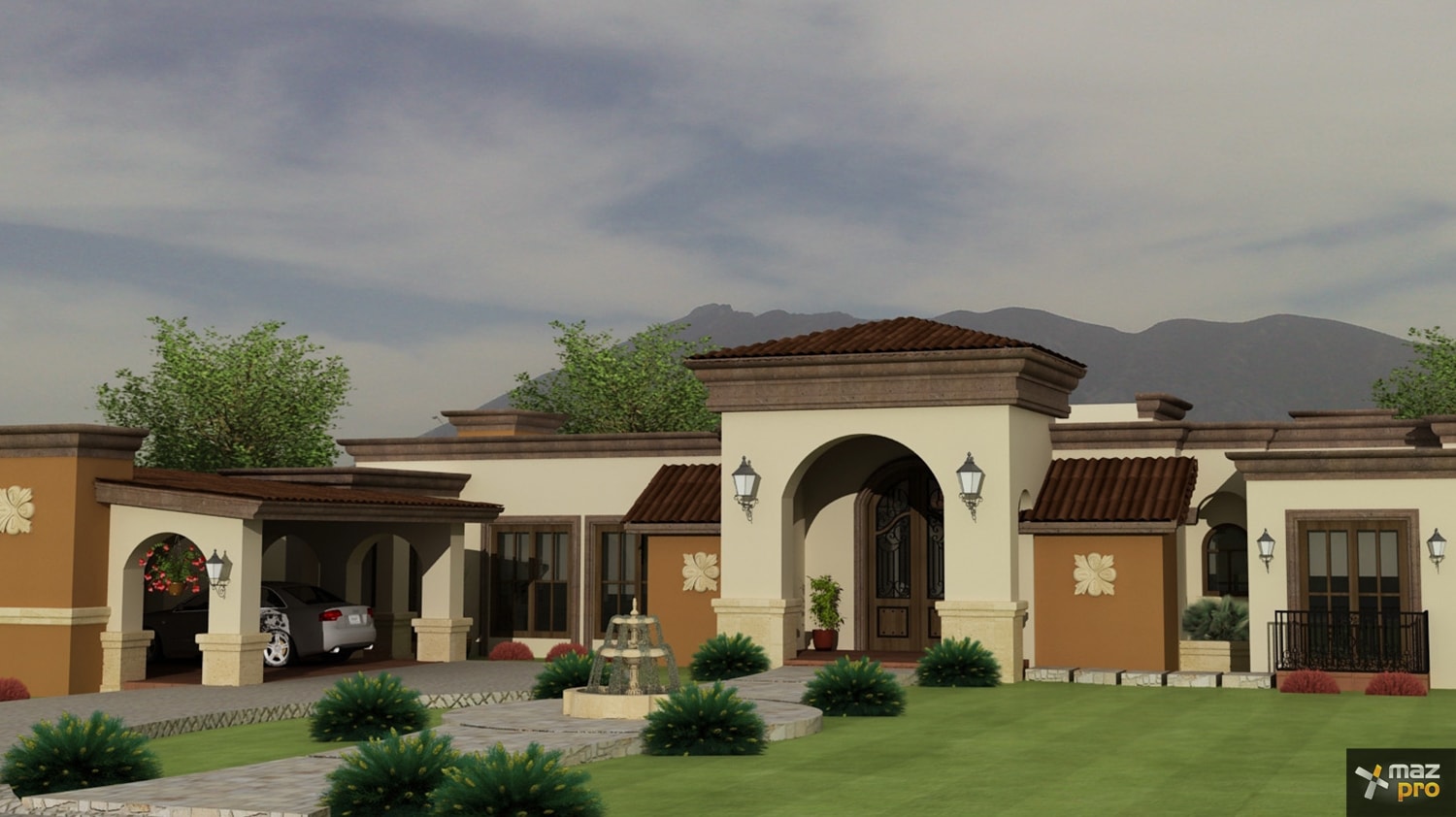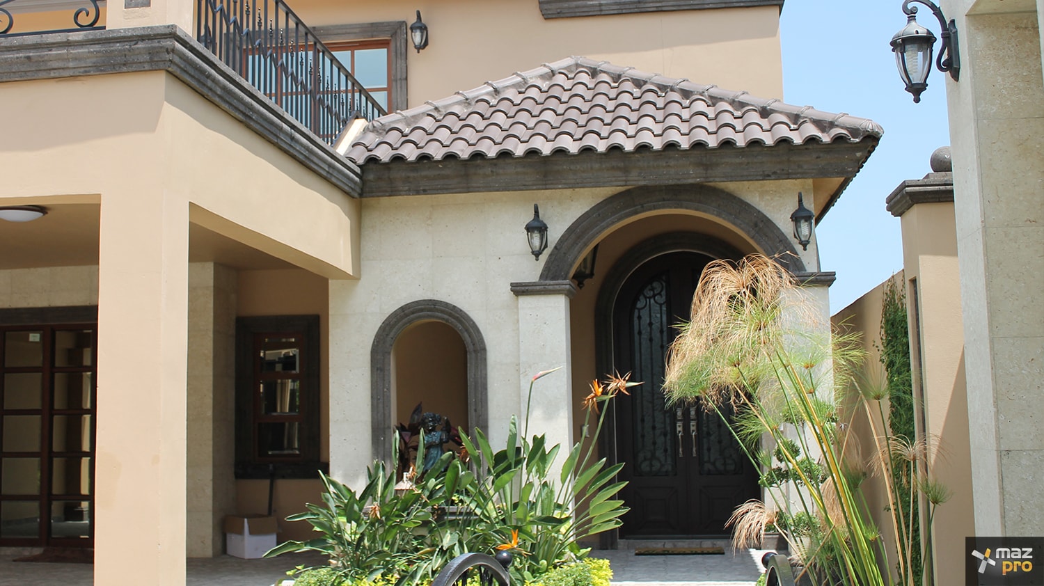 El diseño de esta vivienda ubicada en Santiago N.L. se rige por la estética que predomina en el fraccionamiento y el gusto personal del cliente, de líneas clásicas, se utilizan arcos y molduras, así como teja y piedra. Para los colores se proponen tonos cálidos inspirados en los colores típicos de la arquitectura del noreste.
