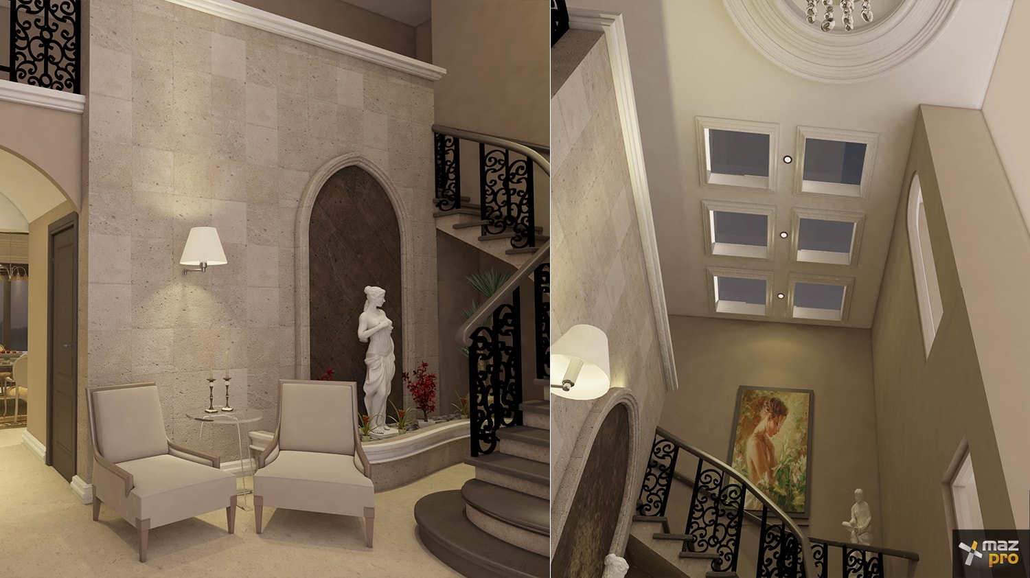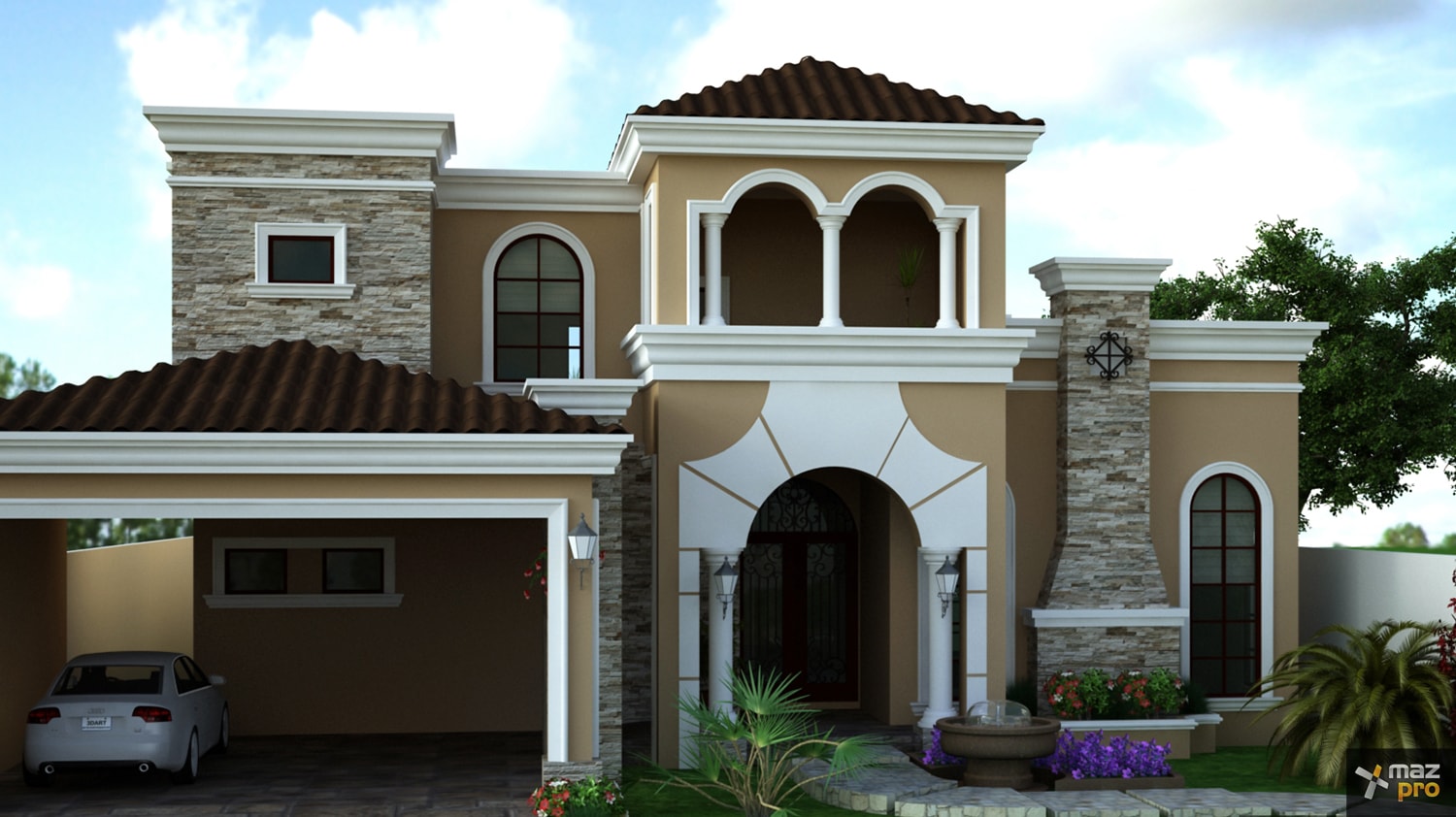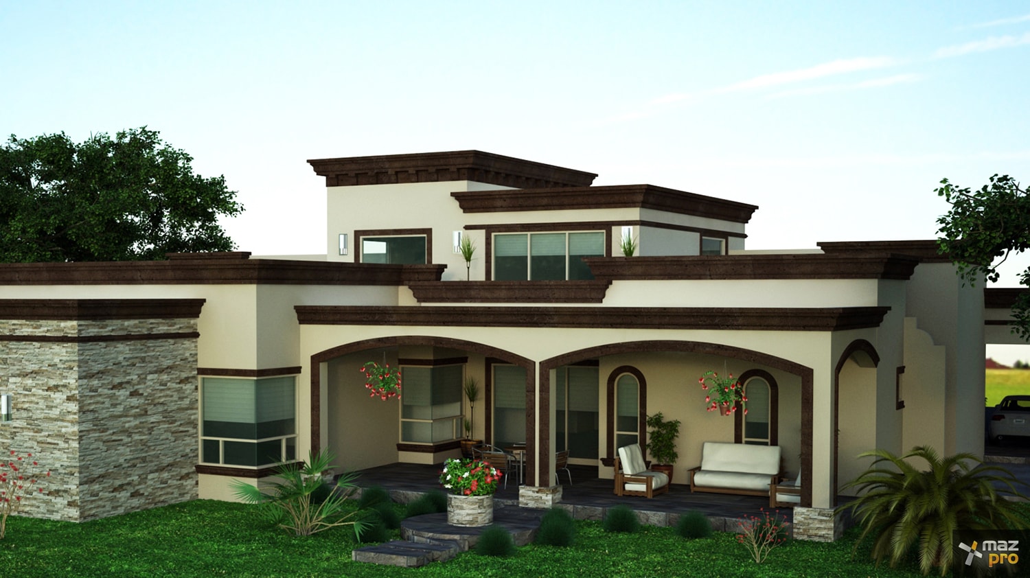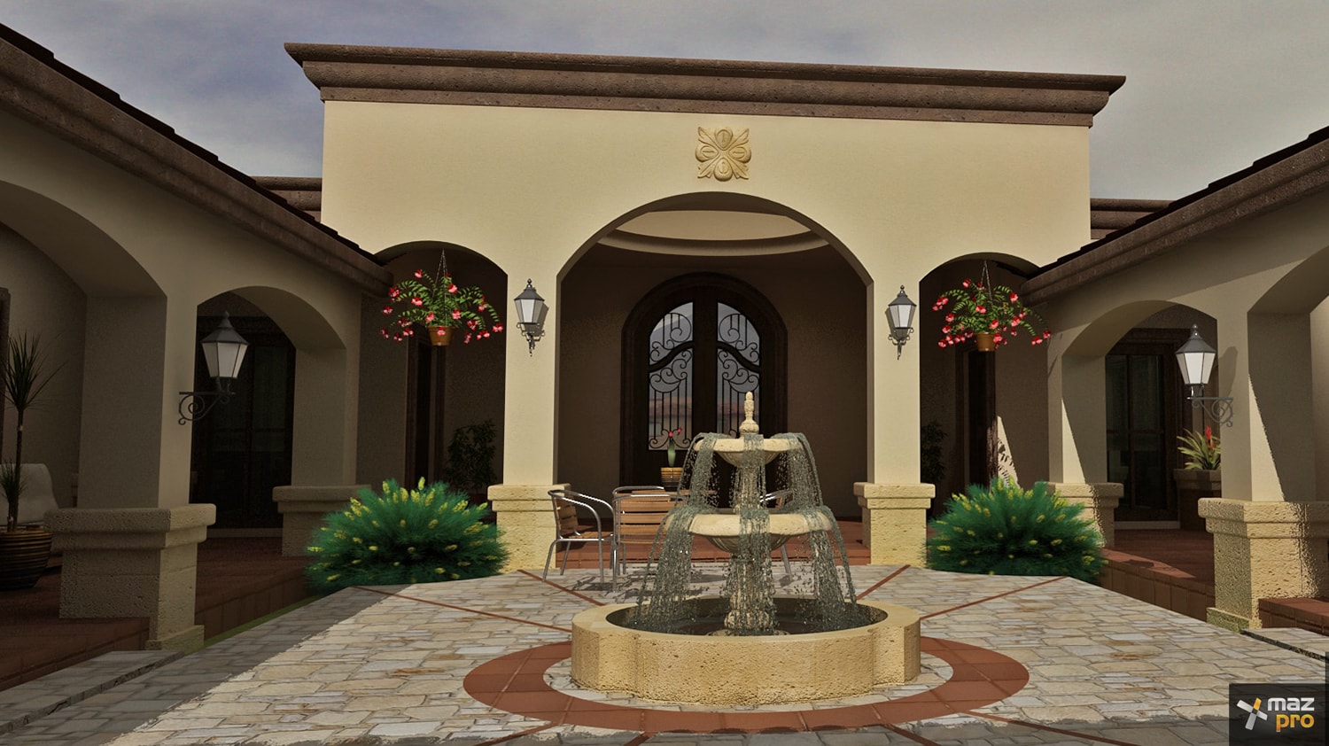 El diseño de esta vivienda ubicada en Santiago N.L. se rige por la estética que predomina en el fraccionamiento y el gusto personal del cliente, de líneas clásicas, se utilizan arcos y molduras, así como teja y piedra. Para los colores se proponen tonos cálidos inspirados en los colores típicos de la arquitectura del noreste.