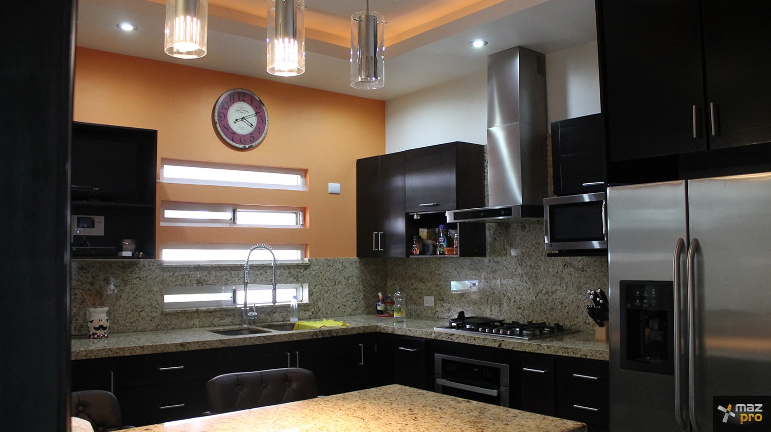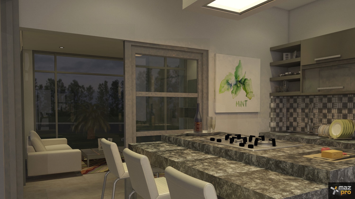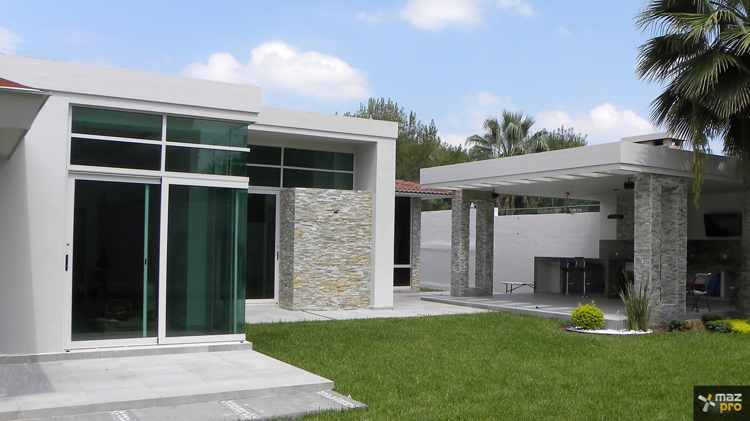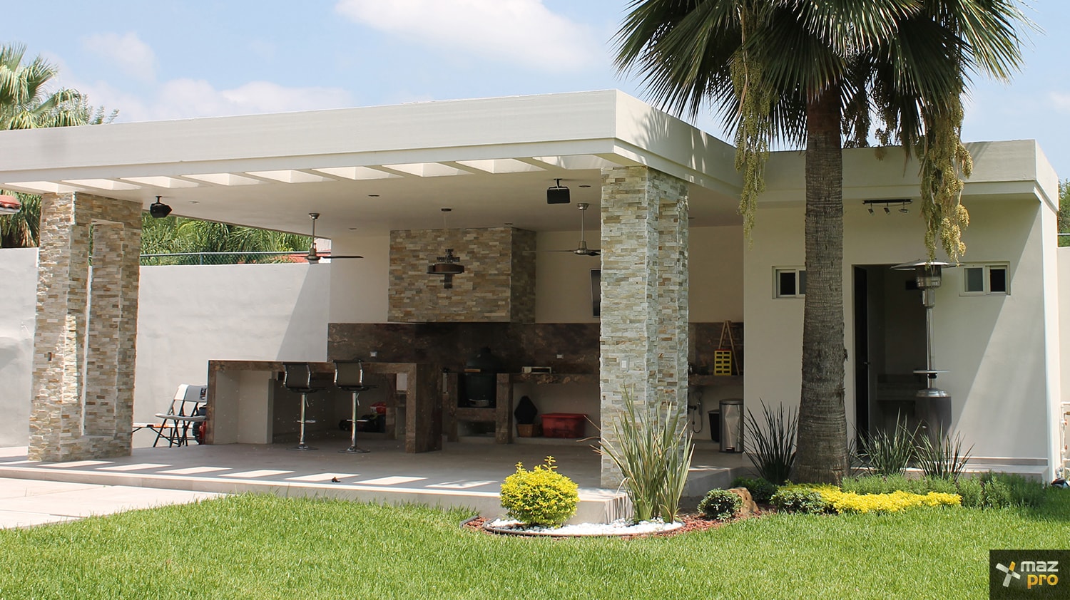 Para este proyecto se buscó integrar el gusto personal del cliente con espacios abiertos que conectaran el área social interior y exterior por medio de una terraza y asador que se acceden desde la cocina, sala, comedor y recámara principal. Las puertas dobles corredizas de la cocina se esconden en los muros de forma que ésta puede estar abierta o cerrada hacia el área social.