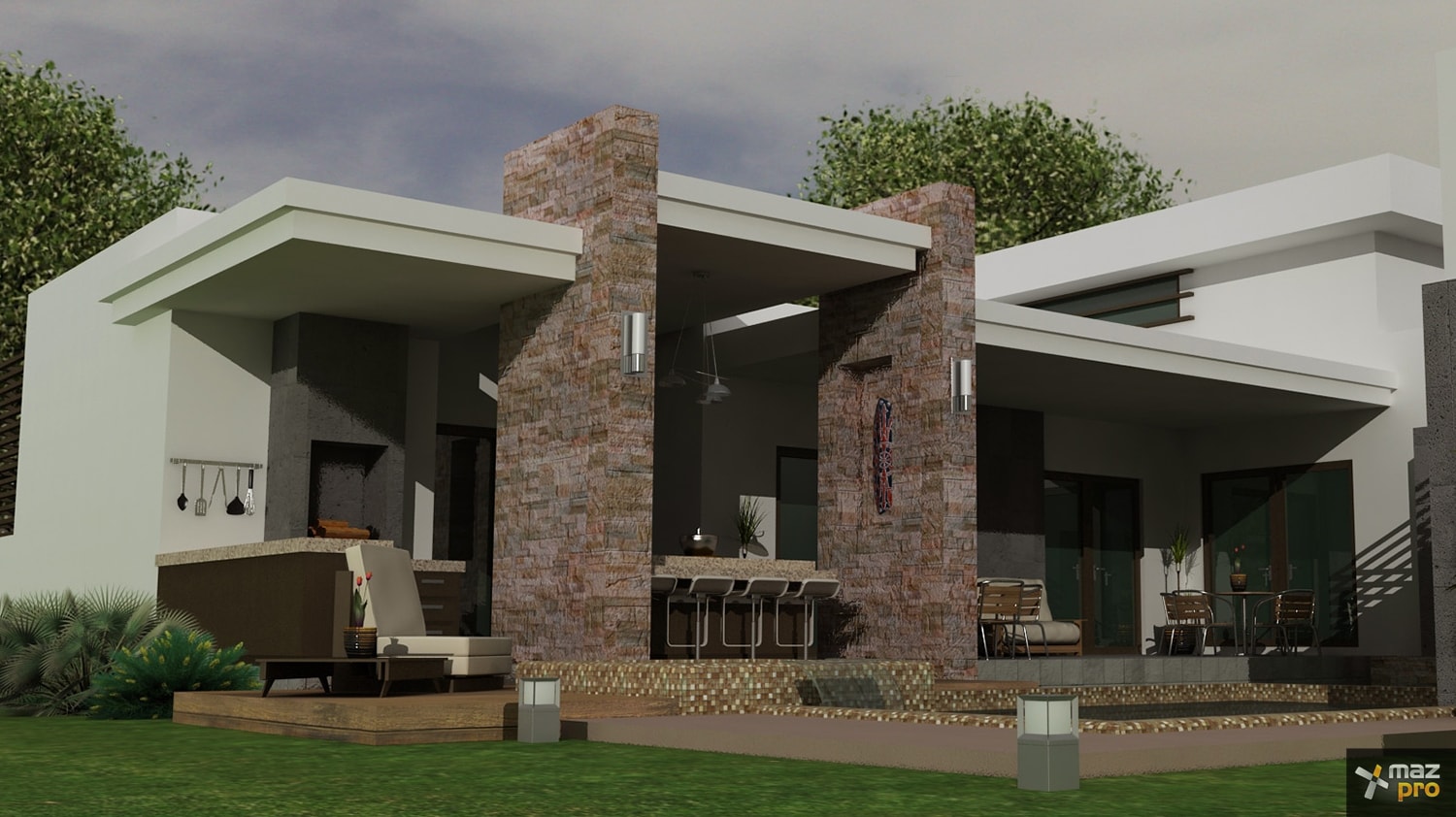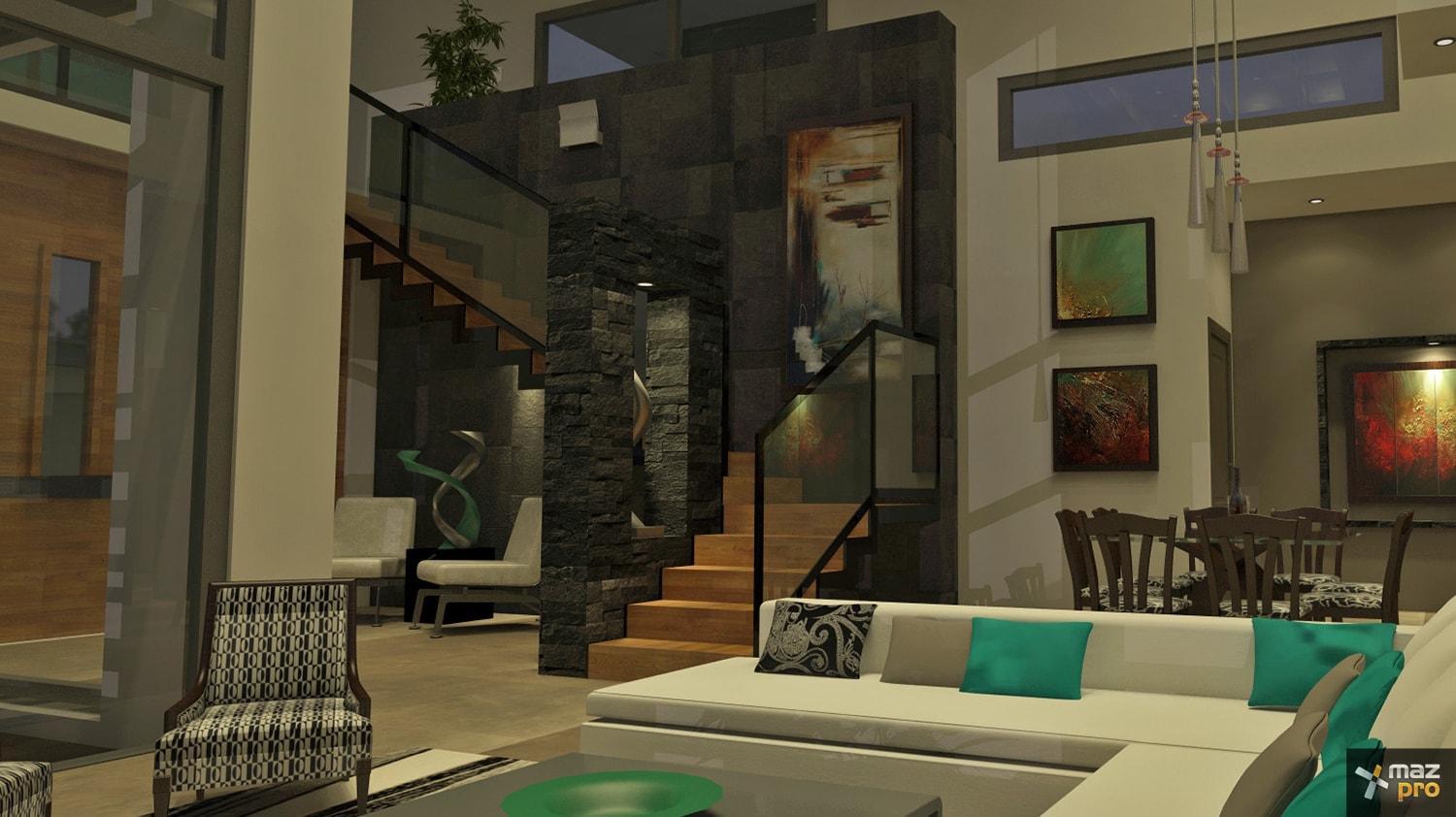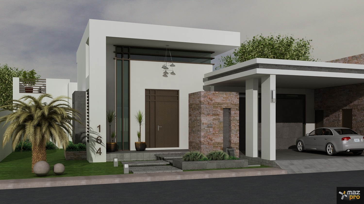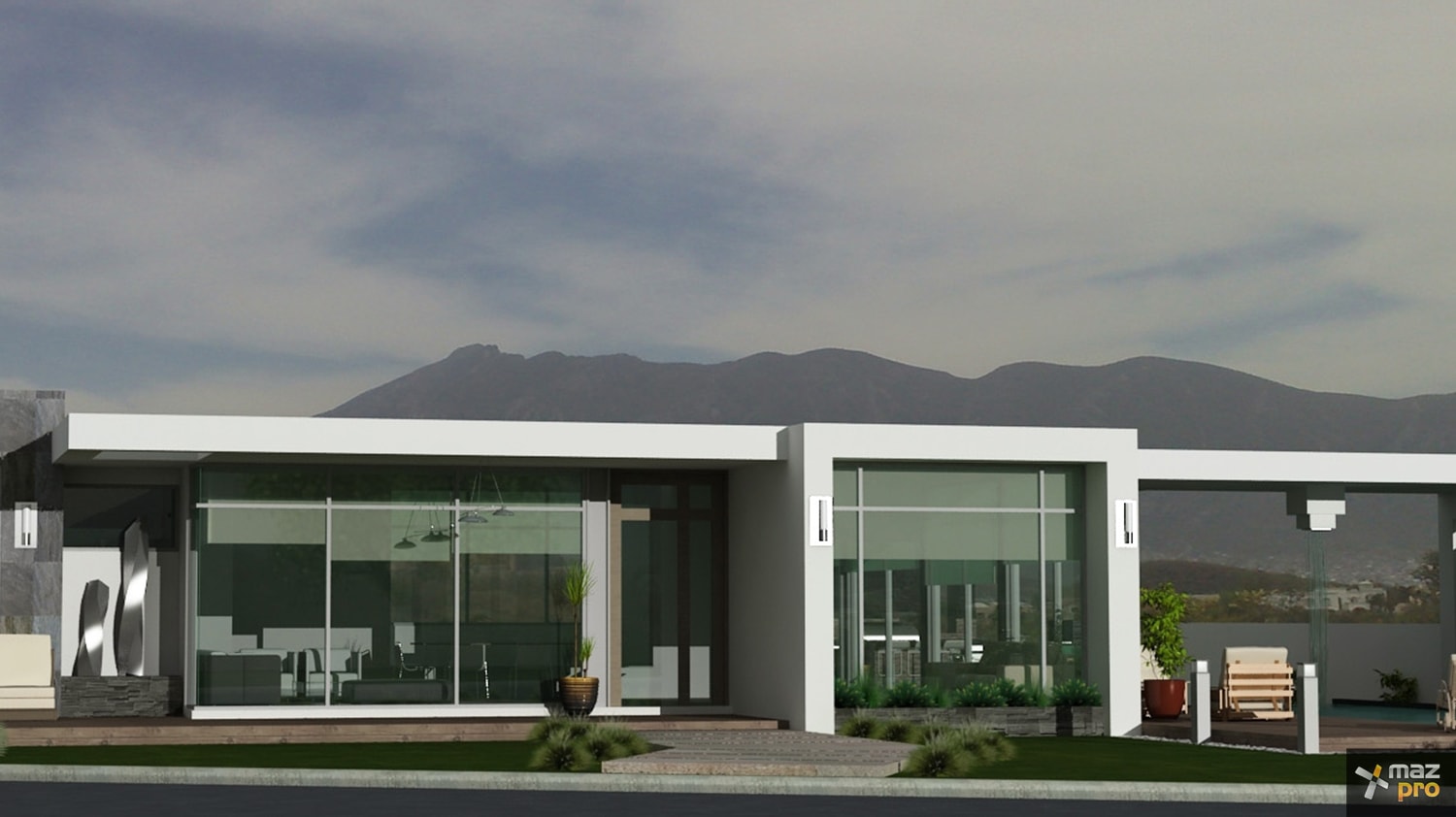 Propuesta de estilo contemporáneo para un programa desarrollado todo en planta baja, con áreas sociales de doble altura que cuentan con ventanas en la parte alta para lograr un espacio amplio e iluminado.