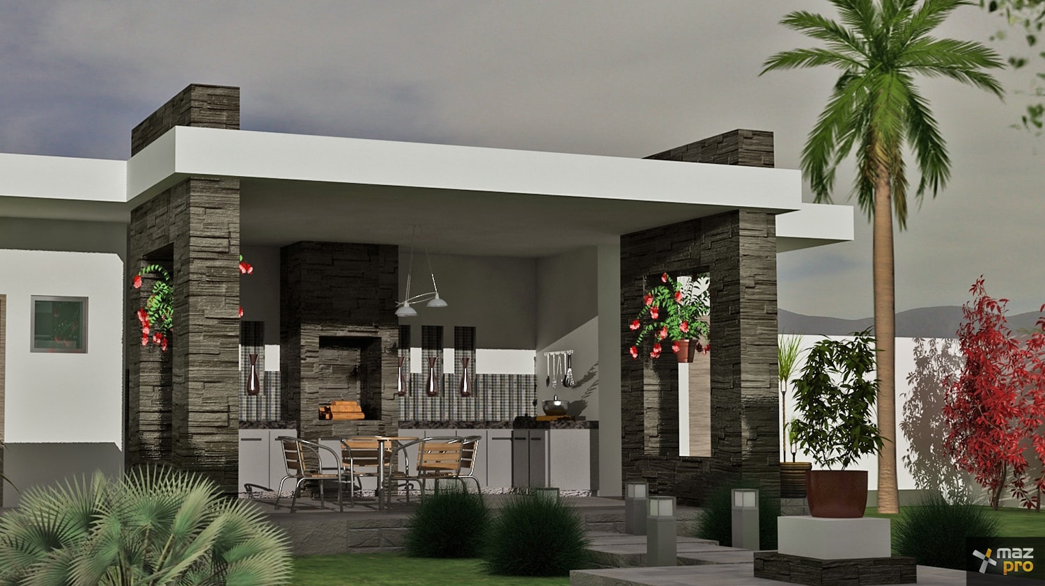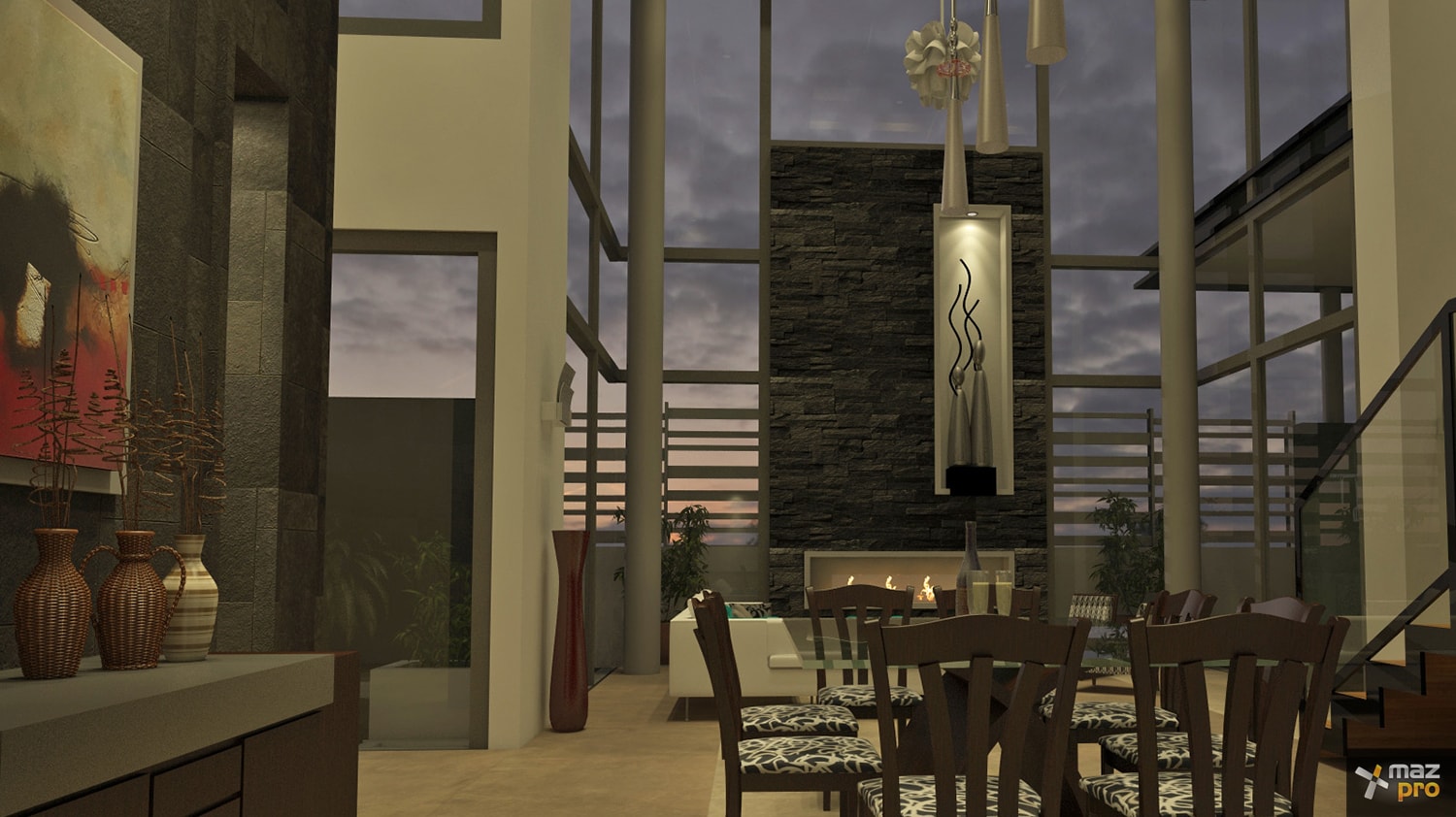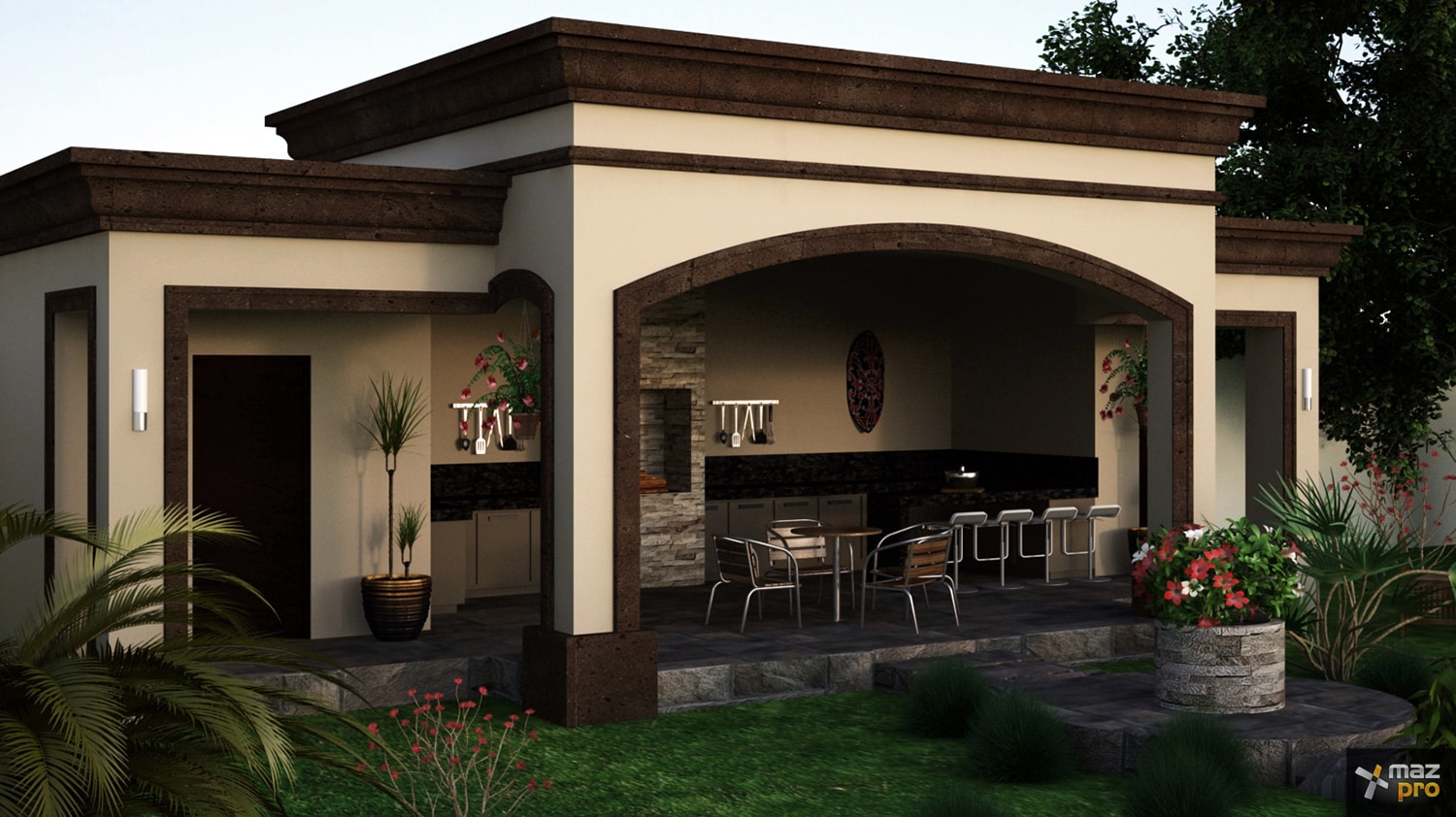 Propuesta de estilo contemporáneo para un programa desarrollado todo en planta baja, con áreas sociales de doble altura que cuentan con ventanas en la parte alta para lograr un espacio amplio e iluminado.