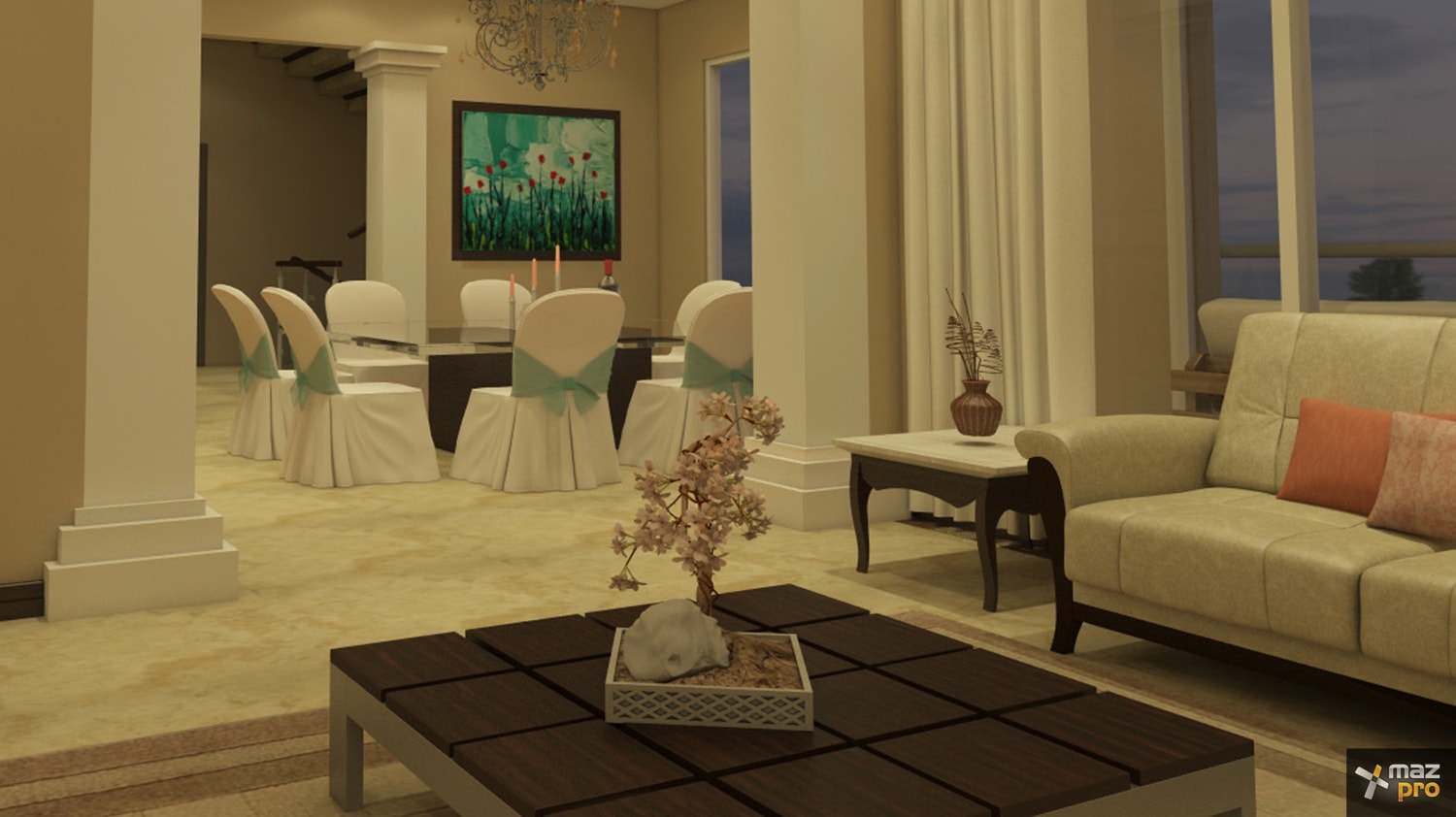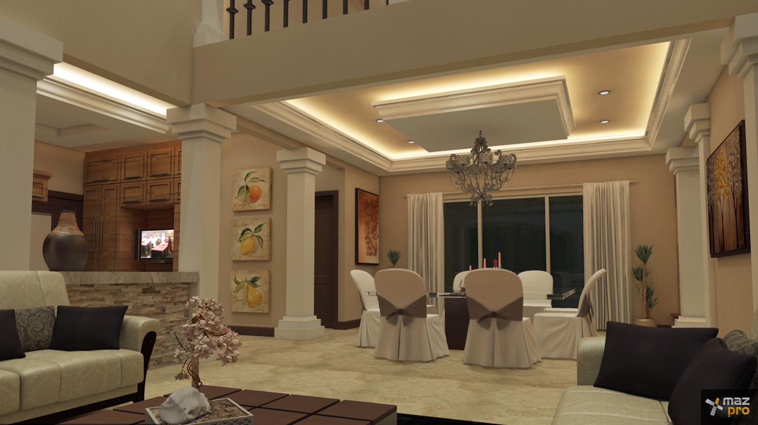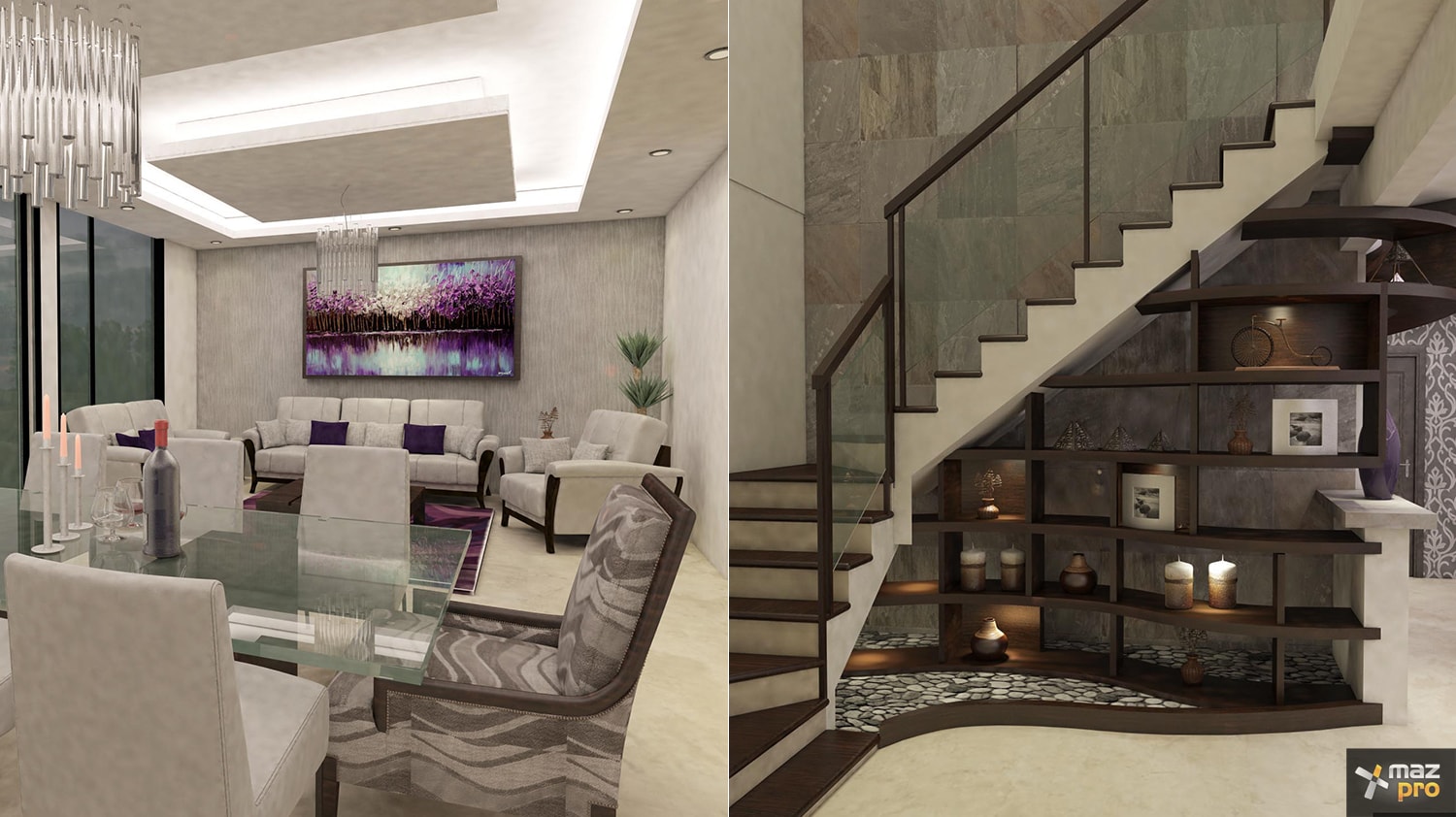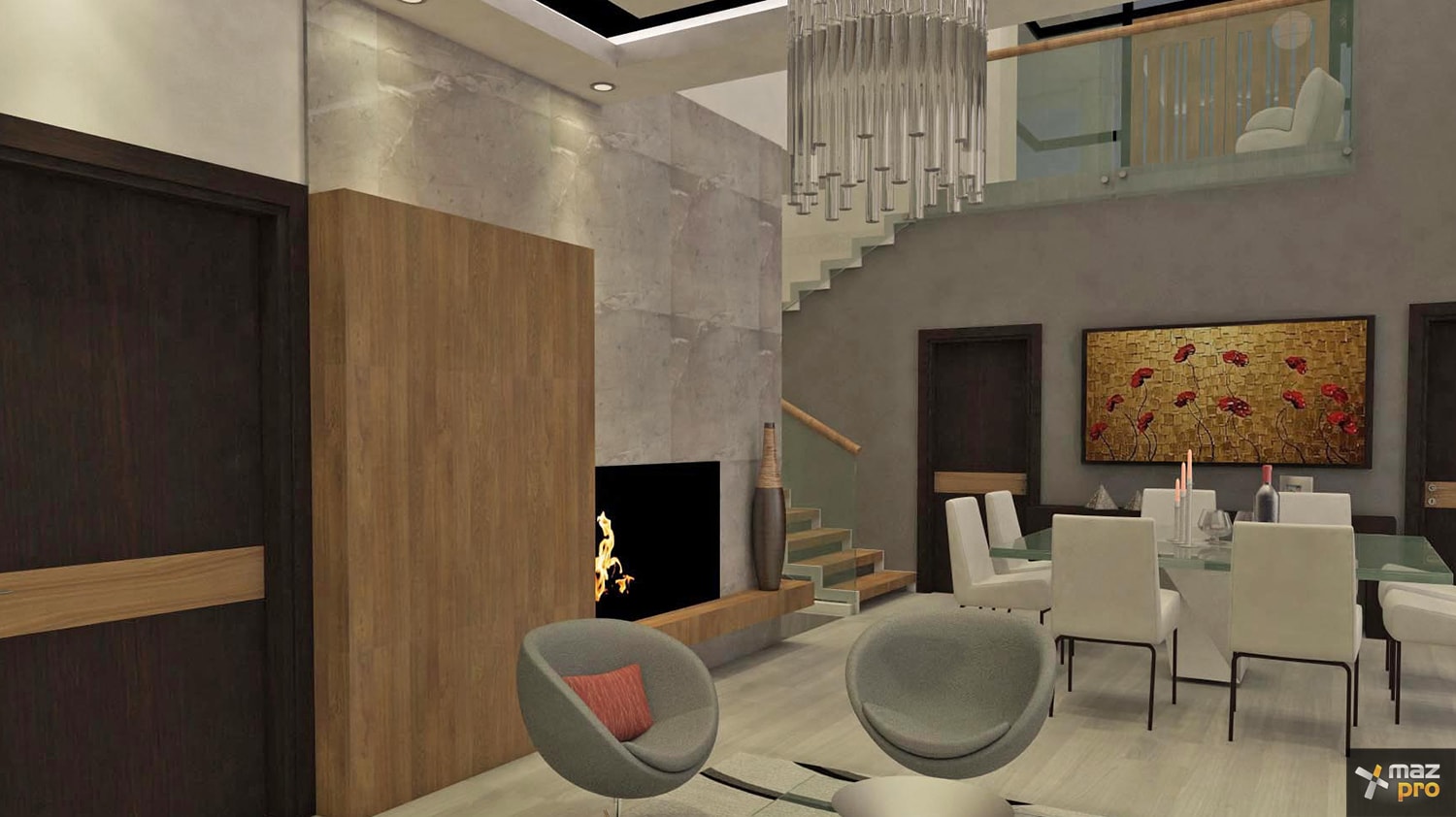 Propuesta de estilo contemporáneo para un programa desarrollado todo en planta baja, con áreas sociales de doble altura que cuentan con ventanas en la parte alta para lograr un espacio amplio e iluminado.