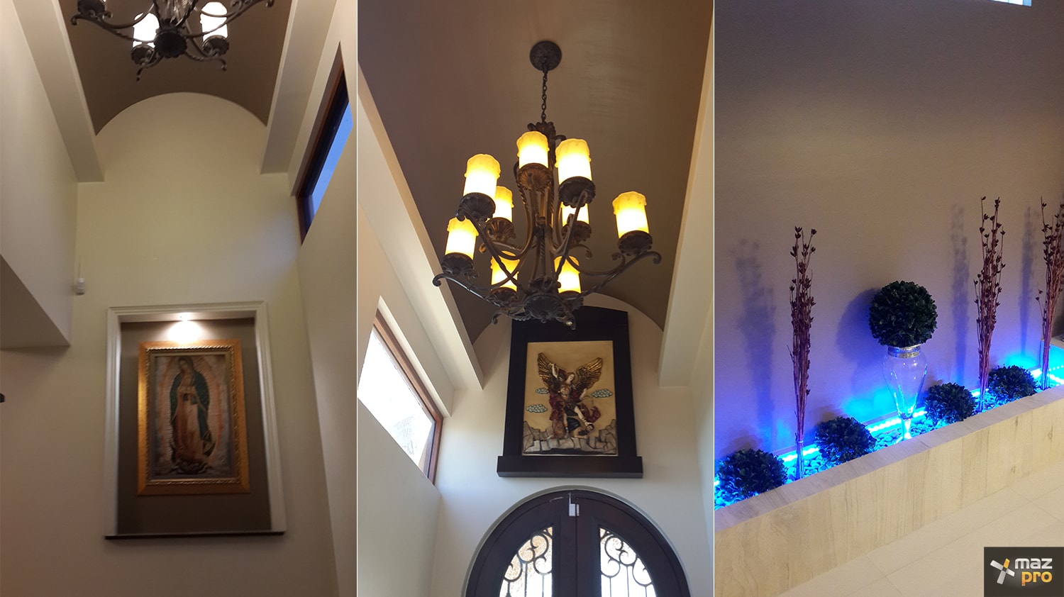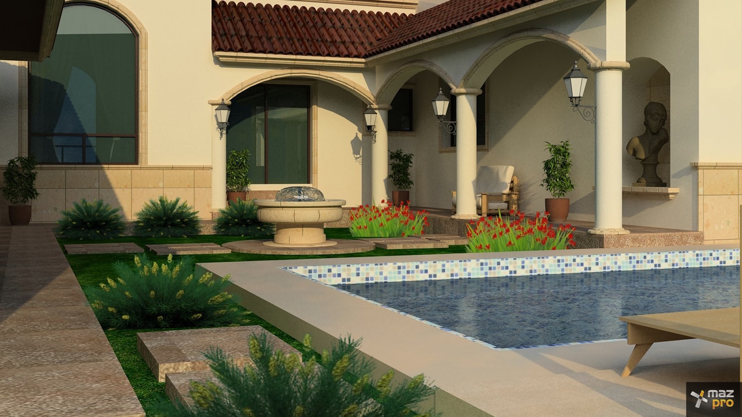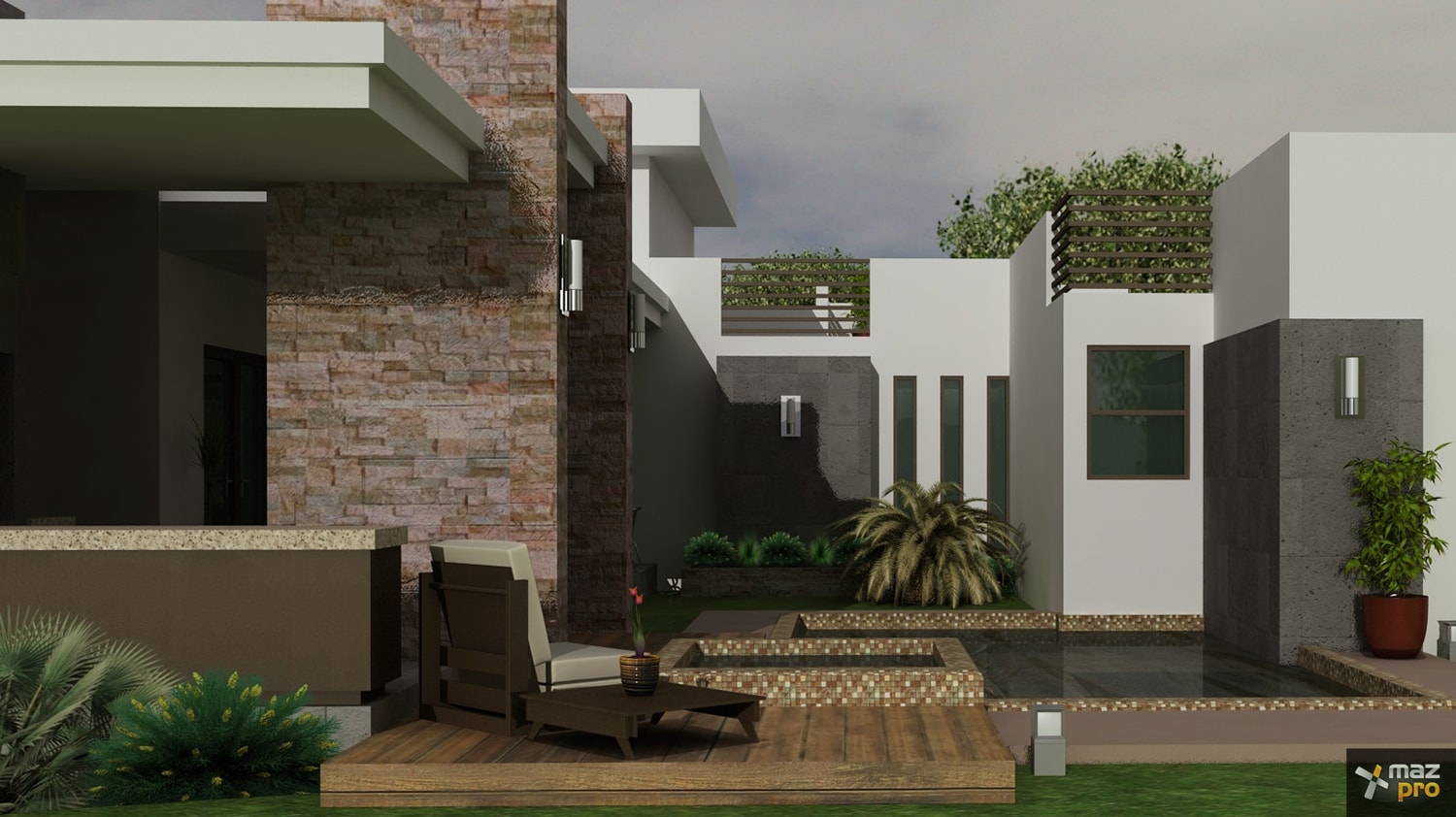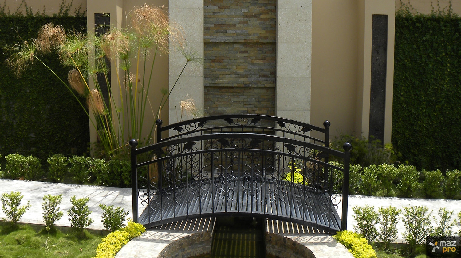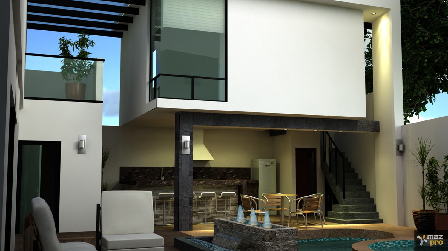 Propuesta de remodelación y ampliación para residencia existente, se diseña un nuevo recibidor y pórtico, así como plafones y detalles interiores. Se rediseñan y completan detalles exteriores inconclusos como una fuente y espejo de agua y un puente de herrería para llegar a la nueva puerta principal.