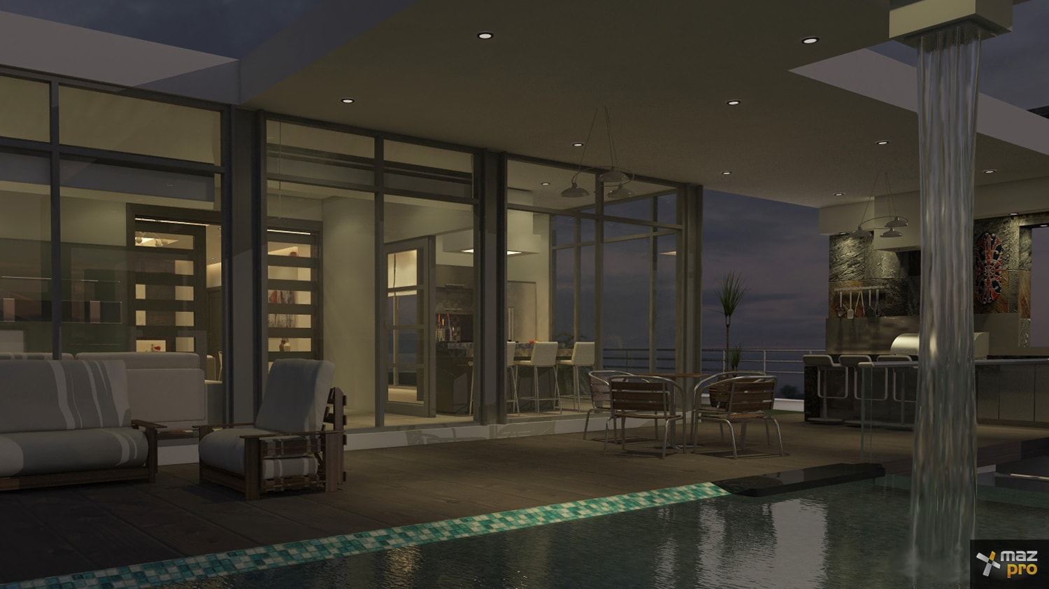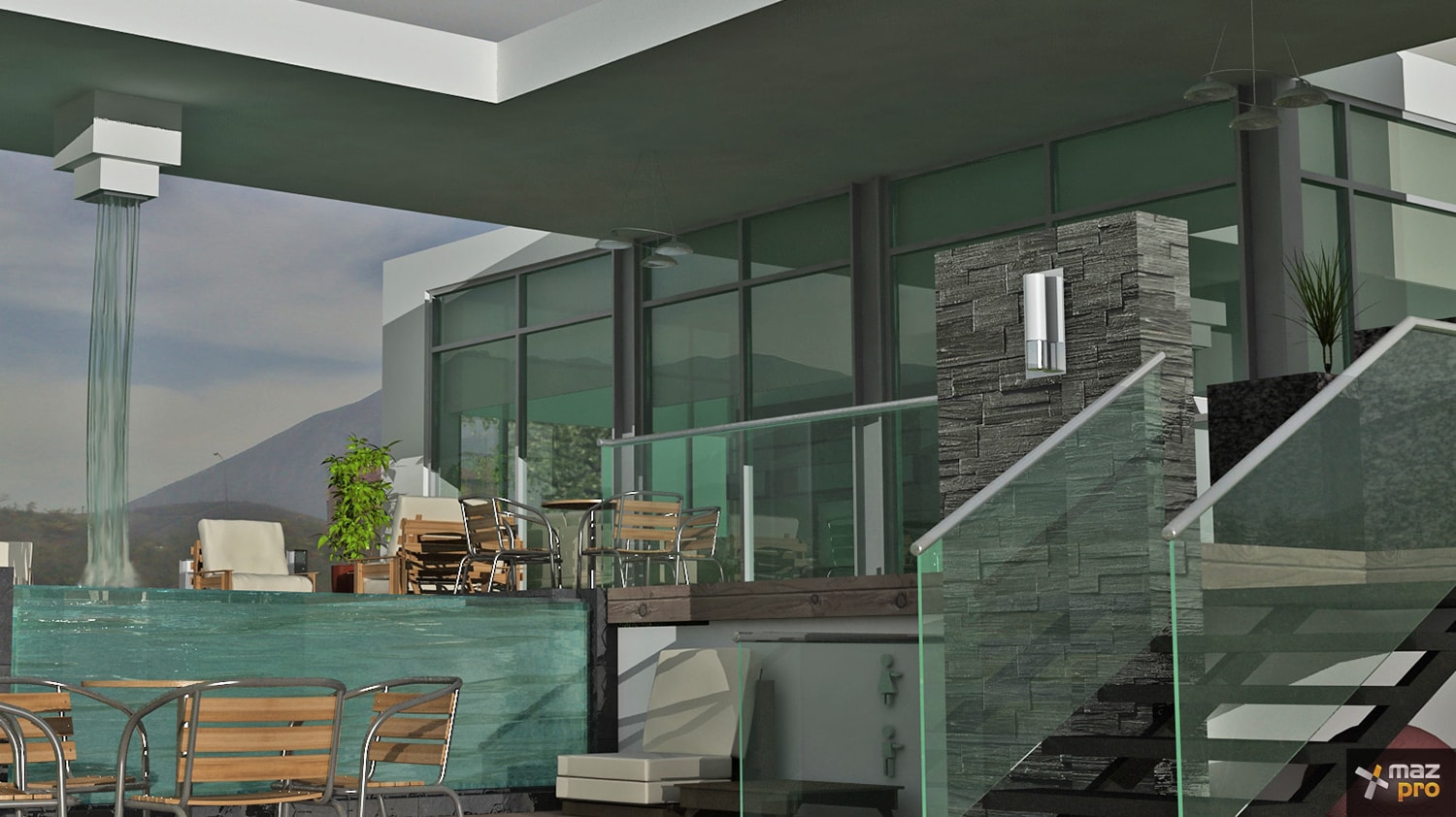 En una ubicación privilegiada cercana a la sierra en Allende N.L. se propone este proyecto que busca maximizar las vistas hacia las montañas y hacia la alberca por medio del cristal. Para la alberca aprovecha el desnivel del terreno con un lado de cristal que desborda en una fuente. El área social interior y exterior se conectan por medio de grandes ventanales.