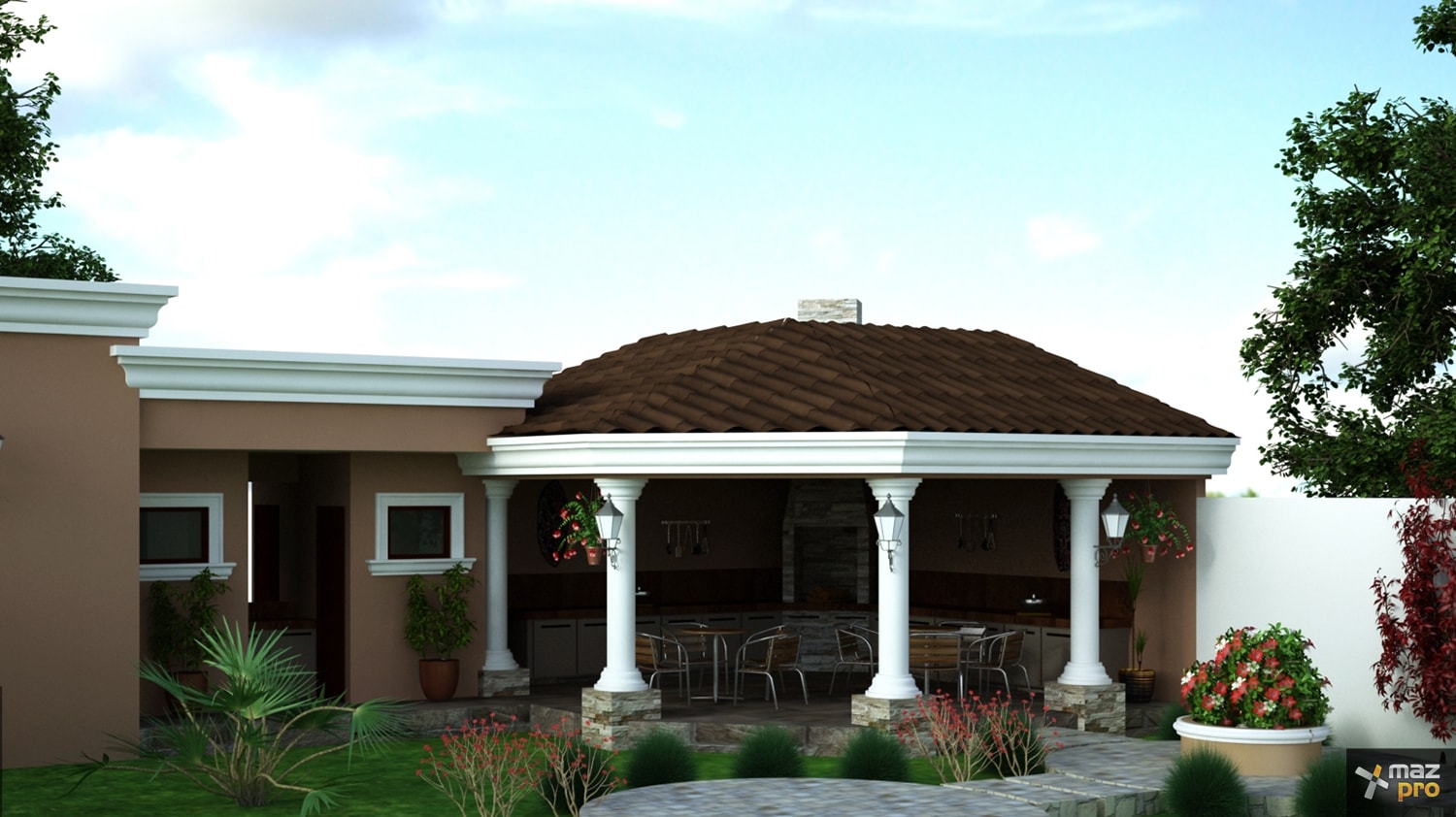 Propuesta de remodelación y ampliación para casa tipo entregada por un fraccionador. Se crea un patio social con asador, alberca y cuarto de juegos en la segunda planta. Se propone remodelación de espacios interiores y ampliación de recámara principal con su vestidor y baño. Todo esto respetando el estilo original de la casa.